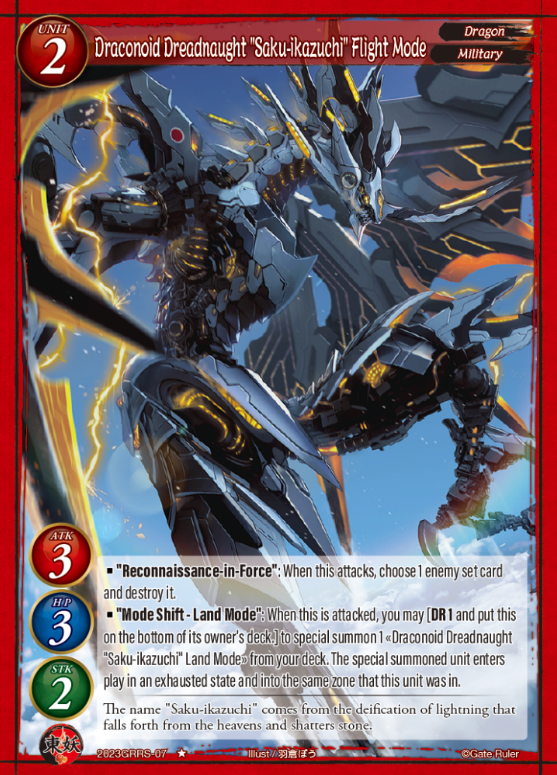 ■ "Mode Shift - Land Mode": When this is attacked, you may [DR 1 and put this on the bottom of its owner's deck.] to special summon 1 "Draconoid Dreadnaught "Saku-ikazuchi" Land Mode" from your deck. The special summoned unit enters play in an exhausted state and into the same zone that this unit was in.