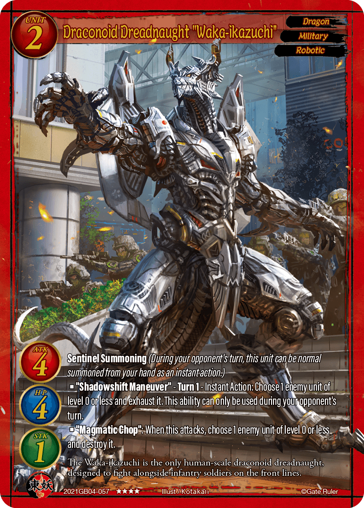 The Waka-ikazuchi is the only human-scale draconoid dreadnaught, designed to fight alongside infantry soldiers on the front lines.