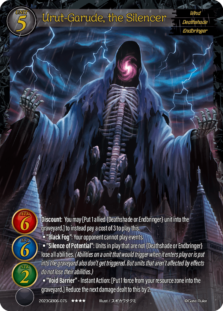 ■ "Silence of Potential": Units in play that are not {Deathshade or Endbringer} lose all abilities. (Abilities on a unit that would trigger when it enters play or is put into the graveyard also don't get triggered. But units that aren't affected by effects do not lose their abilities.)