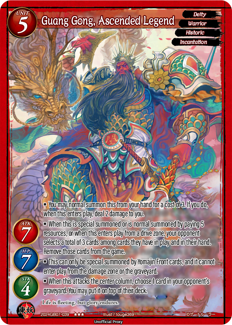 ■ When this is special summoned or is normal summoned by paying 5 resources, or when this enters play from a drive zone, your opponent selects a total of 3 cards among cards they have in play and in their hand. Remove those cards from the game.