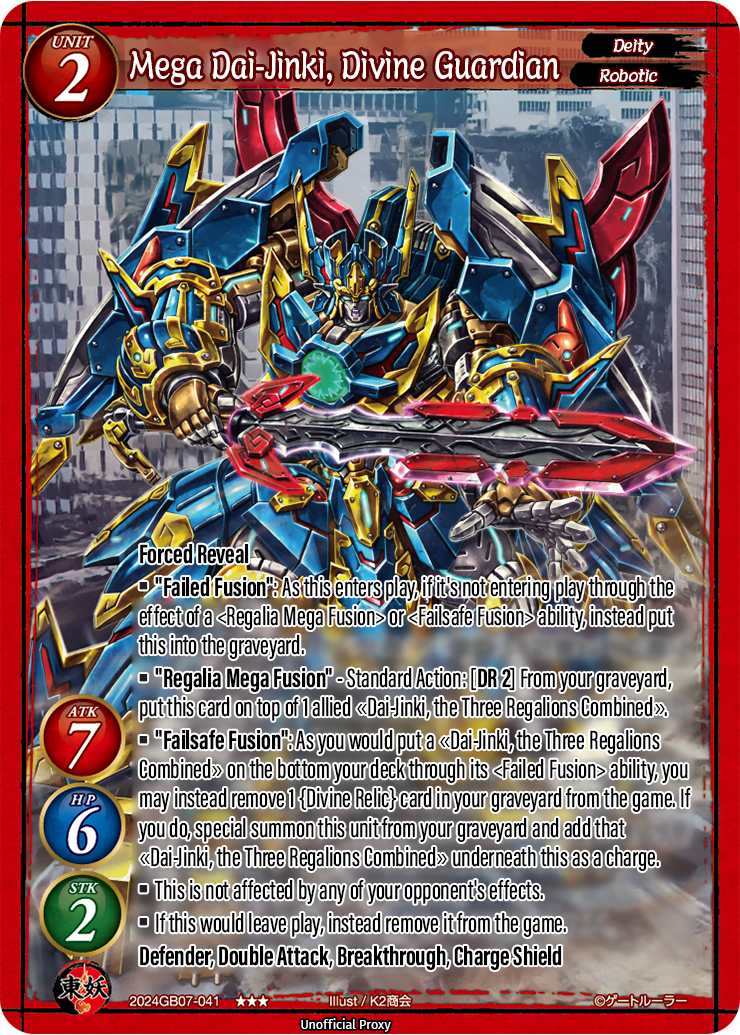 ■ "Failsafe Fusion": As you would put a «Dai-Jinki, the Three Regalions Combined» on the bottom your deck through its <Failed Fusion> ability, you may instead remove 1 {Divine Relic} card in your graveyard from the game. If you do, special summon this unit from your graveyard and add that «Dai-Jinki, the Three Regalions Combined» underneath this as a charge.